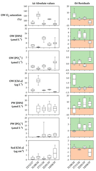 Statistically significant differences were detected between the sampling events in all water-column properties and sedimentary Chl a (p < 0.01), but no such differences were present in the remaining sedimentary properties (PW DIN, p = 0.851; PW PO43−, p = 0.151).