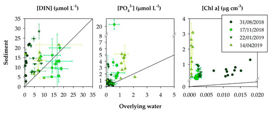 Comparison of the overlying water (x-axis) and sedimentary (y-axis) concentrations of DIN, PO43−, and Chl a at all primary channel stations recorded during the 10-station sampling events. The solid line indicates a 1:1 analogy.
