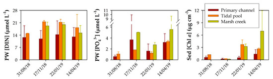 The auxiliary stations, such as the marsh channel and a sandy tidal pool flushed at high tide, represent a contrast to the primary swash channel as settings of lower solute exchange between the water column and sediments (see Section 2.2). Sedimentary physical and geological properties at the three stations and sampling events are compared in Table 1, while pore-water DIN and phosphate and sedimentary Chl a are shown in Figure 8. The three settings exhibited values at similar magnitudes (p > 0.01) on all dates, with the exception of sedimentary Chl a on 22 January 2019 and 14 April 2019. Post-hoc analysis (Student–Neuman–Keuls) indicated that the primary channel had statistically lower values than the other settings on 22 January 2019, and the marsh creek setting on 14 April 2019. On 31 August 2018, we also determined sedimentary LOI550 in the tidal pool at 0.89%, as compared to 0.69 ± 0.53% in the primary channel stations.