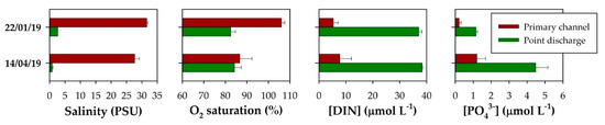 Comparison of salinity, O2% saturation, dissolved inorganic nitrogen (DIN), and phosphate (PO43−) in primary channel stations and point discharges during the two sampling events when these discharges were present. Primary channel DIN and PO43− are overlying water values.