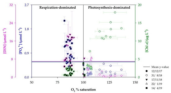 Overlying water concentrations of DIN, PO43−, and Chl a on the main sampling dates are shown in relation to O2 saturation. The vertical black line indicates 100% O2 saturation. The horizontal colored lines indicate the mean values of the concentrations blotted on the vertical axes.