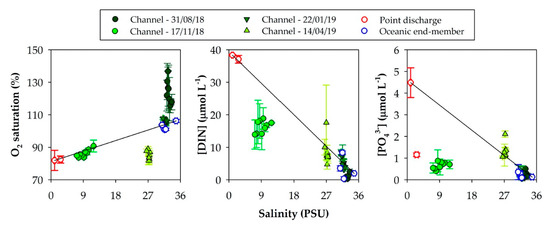 The effort to synthesize all the data from our study and, consequently, to capture the full range of salinities we documented and their concomitant oxygen and nutrient concentrations, is shown in Figure 11. The plotted trends indicate that direct freshwater inputs and oceanic end-members across our sampling events capture anticipated theoretical end-member features. The data from the remaining primary channel stations fail to align on these conservative mixing models in a manner consistent with the fundamental seasonal shift between photosynthesis and respiration (Equation (1)), an outcome which is in agreement with our sink–source analysis already discussed in this section.