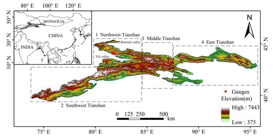 The Tianshan Mountains (TSM) are located in Central Asia and northwest China. In China, the TSM are located from 34.34° to 55.43° N and from 75° to 96.37° E []. The mountain range extends approximately 1700 km from east to west and 400 km from north to south [,] and is an important demarcation line between southern Xinjiang and northern Xinjiang in China [], which form two different natural landscapes. The TSM are far from the ocean, with little precipitation and extremely uneven distribution []. The average annual precipitation is 180 mm in the whole region, but the average annual precipitation of the northern slope is more than 200 mm, and that of the southern slope is about 150 mm []. The daily temperature variations is large, which is a typical continental climate [,,]. The height and orientation of the TSM have an important influence on weather patterns, precipitation distribution and precipitation forms []. The topography of the TSM is complex, and the precipitation is closely related to the topography. The topography plays a vital role in forming a distinct local climates. The precipitation in the north of the TSM is larger than that in the south, the mountain area is larger than the plain, and the largest precipitation occurs in the Yili Valley. In terms of temperature distribution, the northern slope of the TSM is colder than the southern slope, and the western slope is colder than the eastern slope.