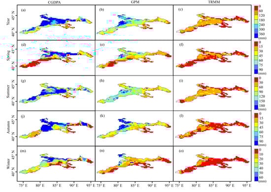 Spatial distribution of annual and seasonal total precipitation (mm) by the China Gauge-based Daily Precipitation Analysis (CGDPA) (a,d,g,j,m), the Global Precipitation Measurement (GPM) (b,e,h,k,n), and the Tropical Rainfall Measuring Mission (TRMM) (c,f,i,l,o) in the Tianshan Mountains (TSM) of China from 1 April 2014 to 31 March 2015. Year (a–c), spring (d–f), summer (g–i), autumn (j–l), winter (m–o).