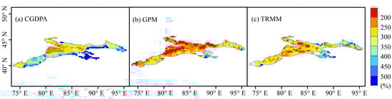 The GPM and TRMM datasets significantly underestimated the larger CV over southwest Tianshan and east Tianshan. Overall, the TRMM data are more consistent with the daily variability of precipitation in this area.