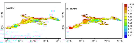 - On a daily scale, GPM and TRMM obviously underestimate the larger CV values. Overall, GPM performs better than TRMM in detecting precipitation events. GPM is superior to TRMM with regard to the POD and CSI, where the POD is significantly higher. As for the FAR and FBI, TRMM is slightly better than GPM. The detection capabilities of the GPM/TRMM for precipitation events in the middle and east of Tianshan are significantly lower than in the northwest and southwest.