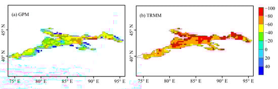 Previous studies have shown that satellite precipitation products do not perform well in Xinjiang, China []. However, in this study, we evaluated the GPM/TRMM datasets on different temporal scales (annual, seasonal, and daily) and it was found that GPM showed significant improvement compared with its predecessor TRMM. From the above analyses, it can be seen that the GPM-IMERG and TRMM datasets show obvious spatial differences in the precipitation estimation of TSM, with greater precipitation in the north than the south and in the west than the east (Figure 2). The seasonal pattern is that the precipitation is more in summer and less in winter. Both satellite products can track and observe the spatial variation of precipitation. This is consistent with other results []. The main reason for the formation of this feature is that the large-scale mountain of TSM intercepted and uplifted the water vapor from Atlantic and Arctic Ocean, resulting in obvious precipitation gradient. Both satellite products underestimated annual precipitation, which is reasonable and has been reported in other high mountains areas [,]. Because arid areas have less rainfall and low water vapor in the atmosphere, it is difficult to detect by satellite sensors.