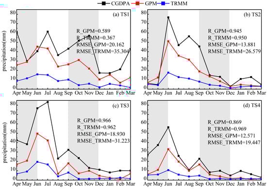 Annual variability is significant in areas with low precipitation. In order to further test the ability of satellites to describe the temporal variability of precipitation in the TSM, we analyzed the annual precipitation changes in different subregions based on the GPM/TRMM datasets, as shown in Figure 6. The seasonal distribution of precipitation in the TSM is uneven. The precipitation is mainly concentrated in summer and reaches its minimum in winter, especially in TS3 and TS4. Compared with the ground observations, the satellite datasets portray the annual variability of precipitation well, especially in TS2 and TS3, achieving high correlations (above 0.9). However, both of the satellite products underestimate the annual precipitation. Overall, GPM and TRMM have similar statistical behaviors, but GPM has a lower RMSE in the four subregions and performs better.
