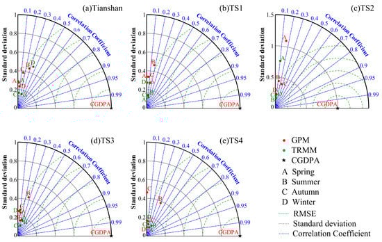 To show the statistical comparison of the seasonal variation of precipitation in the TSM and its subregions in 2014, we plotted a standardized Taylor diagram [] and provide a summary of the corresponding degree between the estimated and observed precipitation by considering three statistics: standard deviation (SD), R and RMSE. The normalized Taylor diagram uses the SD and RMSE of the reference value and variable value divided by the SD of the reference value, which eliminates physical-unit quantities. The result is shown in Figure 7. Among these, the radial coordinate represents the standard deviation, shown in black dashed lines, and the green semicircle represents the RMSE. Meanwhile, the angular coordinate represents R value, which is shown in blue dashed lines. In these figures, CGDPA represents the ground reference dataset (CGDPA is the reference point), and the other values were derived from the satellite precipitation datasets in different seasons. The closer the points of satellite precipitation are to the reference points, the better the product is.