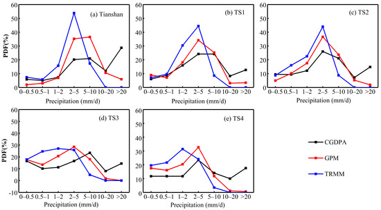 Probability density function (PDF) of precipitation estimation in Tianshan and four subregions.