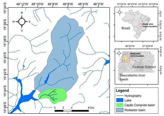 The study area comprised, as the experimental basin, the Capão Comprido basin, located at the west portion of the Federal District, between the west longitude meridians 48°10′07″ and 48°06′13″, and the south latitude parallels 15°43′42″ and 15°45′41″ covering an area of approximately 16 km2. The Ribeirão Rodeador basin, with 113 km2, was used to validate the study (Figure 1).