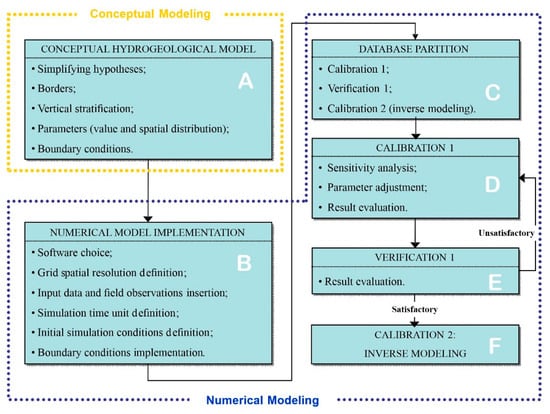 Steps of the numerical modelling method (A: items of the conceptual hydrogeological model, B: steps of the numerical model implementation, C: database partition between modeling steps, D: steps of the calibration process, E: calibration process evaluation, F: recharge estimation by inverse modelling) [,].
