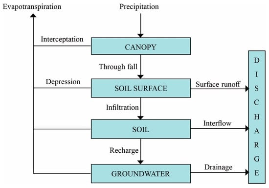 This step was based on applying the model WETSPA—Water and Energy Transfer between Soils, Plants, and Atmosphere []. It is a physically based distributed model with routines to simulate water flow between the atmosphere, vegetation’s canopy, root zone, transmission zone, and saturation zone, as illustrated in Figure 3.
