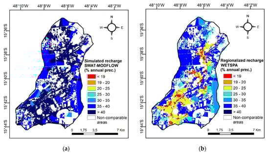 The present work mapped 85 possible combinations of type of soil, land use and slope at the Ribeirão Rodeador basin. The average values for the simulated recharge in Araujo [] are presented on the map in Figure 4a. Figure 4b presents the regionalized values from the abacus application. For some areas in the Rodeador basin it was not possible to map and compare the values due to the existence of combination between factors that are not present in the Capão Comprido basin, used to formulate the abacus. The recharge rates estimated by the methods “Numerical Modelling—NM” and “Water Table Elevation—WTE” were not included in the comparison, because they perform “effective recharge” estimations [,] and, consequently, give lower estimations than the ones obtained with the vadose zone methods, such as SWAT-MODFLOW and WETSPA.