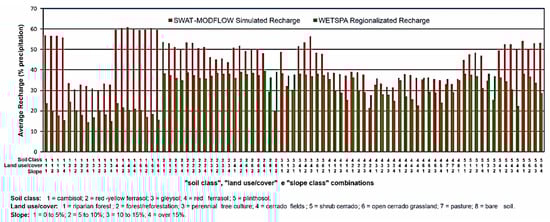 Despite the discussion about the limitation of the model SWAT-MODFLOW, the results obtained by Araujo [] indicate that the model’s recharge estimations are more reliable. In this model, the simulation of surface and groundwater flows are integrated, exploring the strengths from each original model—SWAT simulating surface water flow and MODFLOW simulating groundwater flow—thus making the global modelling more robust to represent every flow in the hydrographic basin []. Using the integrated model, Araujo [] compared simulated flow rates with measured flow rates, obtaining satisfactory results for the performance indexes, which indicate SWAT-MODFLOW model’s ability to represent the hydrological processes in a Cerrado environment. However, the model tends to overestimate baseflow, which could indicate the overestimation of the recharge. Notably, that could happen in steeper areas with Cambisol, where the rates simulated by SWAT-MODFLOW were higher than in other types of soil in the basin and overcame in more than 100% the regionalized rates generated by WETSPA model.