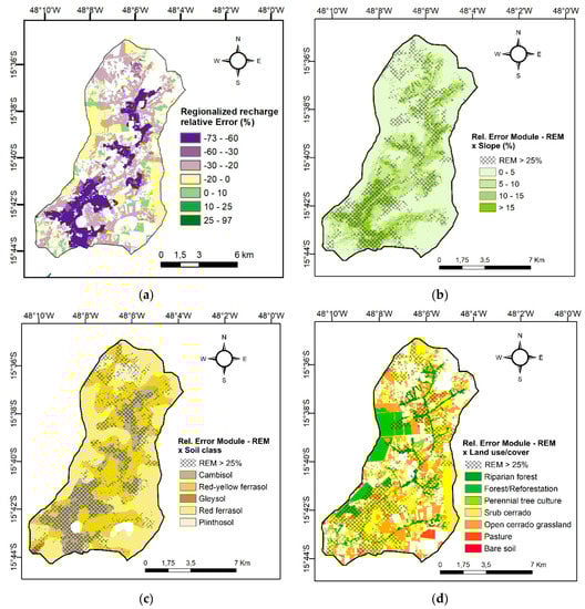 (a) Relative error of the regionalized recharge and its relation with the factors (b) “slope”, (c) “soil class”, and (d) “land use/cover”.
