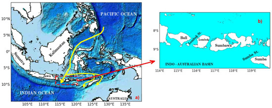 (a) The Indonesian archipelago; yellow arrow shows the water exchange between the Pacific and Indian Oceans. (b) The location of Lombok Strait in the Indonesian archipelago.
