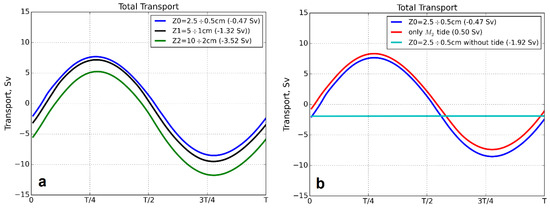 (a) transport through the strait under variants of boundary conditions on the northern boundary for the one tidal period of the M2 wave (T = 12.42 h). (b) tide contribution to transport through the strait.