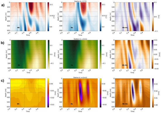 Hydrodynamic characteristics in point A (see Figure 2a) for the tidal period of the M2 wave. (a) temperature; (b) cross-section velocity; (c) vertical velocity. Left column: Nh approach; middle column: Hs approach; right column: difference between Nh and Hs.