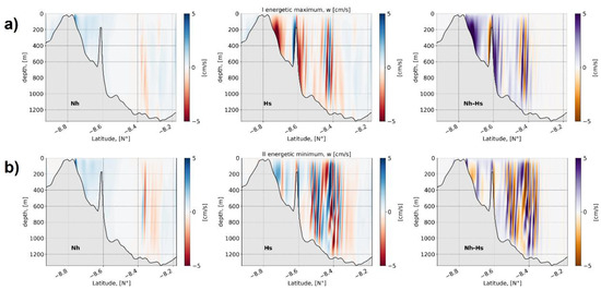 Distribution of vertical velocity in the section along the axis of the Lombok Strait (Figure 2a) in Nh and Hs approaches. (a) I energetic maximum; (b) II energetic minimum. Left: Nh approach; middle: Hs approach; right: difference between Nh and Hs vertical velocities.