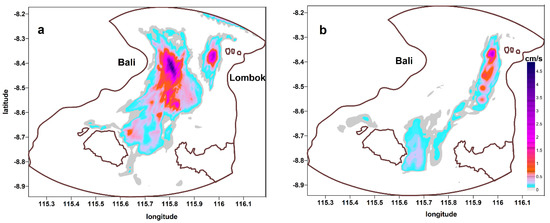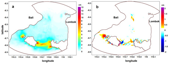 The boundary value problem (1)–(6) in curvilinear coordinates (see Appendix A) is solved with the following parameters: ; bottom friction is ; time step is 35 s. Three-dimensional temperature and salinity field are determined according to [8]. These data were digitalized and interpolated onto the computational mesh with a vertical resolution of 71 layers. Bathymetry data have been compiled from data provided by TCARTA (https://www.tcarta.com/) with a resolution of 90 m by horizontal (Figure 2a). Sea level oscillations data in the Lombok Strait were obtained from the database of the ocean tides TPXO6.2 [43,44].