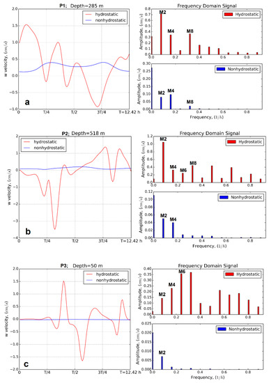 Spectral analysis of vertical velocity is carried out for three points of the Lombok Strait. Figure 11 (left panel) shows the evolution of velocities in the Hs and Nh approaches for the tidal period of the M2 wave. In the right panel, Figure 11 shows corresponding vertical velocity spectra.