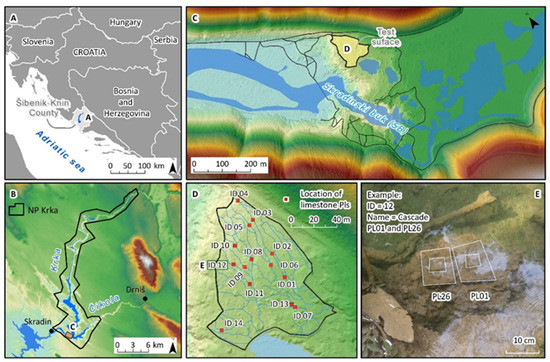 (A) Location of National Park (NP) Krka (NPK) in Croatia; (B) location of the wider area of Skradinski Buk (SB) in NPK (macro-scale); (C,D) location of the test surface within the wider area of SB (meso-scale); (E) example of a limestone plate (PL) location (micro-scale).