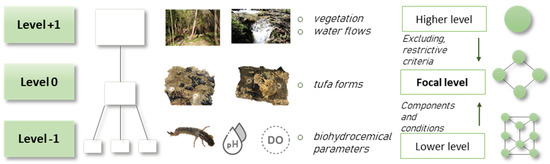 The methodology is based on an interdisciplinary research. This implies the treatment of the perceived problem (tufa landscape degradation) as a whole, taking into account the knowledge from different disciplines. This methodological framework can be regarded as the result of the project implementation. The methodology was divided into macro-, meso- and micro-scale of research following the principle of multi-resolution (hierarchical) landscape modeling (Figure 2). Understanding the changes in the tufa landscape system requires a multiscale approach because analyses over a uniform scale are inapplicable in this case. Landscape hierarchy theory states that understanding of a studied element comes from the lower hierarchical level and significance from a higher hierarchical level [43]. Therefore, the dynamics of the focal element evolution (tufa formation) are influenced by the sets of elements from lower (e.g., biohydrochemical parameters) and higher (e.g., vegetation density, soil morphology) hierarchical levels. Thus, examining such phenomena requires studying the change in elements at different scales [3,44,45].