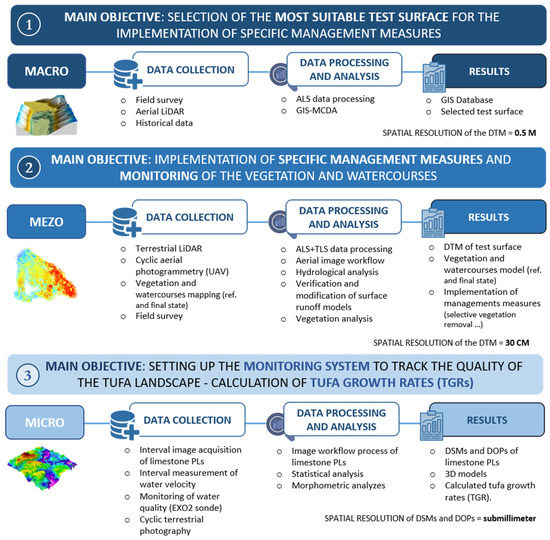 At the macro-scale, the main research objective was to select the most suitable test surface within the wider area of SB on which specific management measures would be implemented. The most suitable test surface means that this area has a detected tufa landscape degradation problem or that there exists a high probability of this occurrence. Furthermore, this area must be accessible for performing various data acquisition methods (terrestrial LiDAR, UAV photogrammetry, installation of PLs, etc.). Implementation of management measures on the entire SB area was not necessary because tufa landscape degradation did not occur everywhere. Additionally, since these measures have not been applied in other protected areas, it was necessary to test their effectiveness on a smaller test surface. The logistical and financial capabilities of the project were also limiting factors.