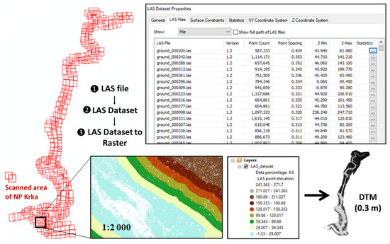 Aerial LiDAR scanning of the six waterfalls and both banks of the Krka River was performed for the purposes of generating the criteria for GIS-MCDA, production of referent digital surface model (DSM), mapping of high vegetation and other needs of the Park administration. Aerial LiDAR scanning was performed using a full-waveform laser measuring system Riegl LMS-Q780. The system was connected to a Eurocopter EC120B helicopter with an integrated Hasselblad H39 camera and a Novatel OEV/OEM4 internal GPS receiver. Data were collected in the NW-SE direction of flight. The laser beam stabilization or deviation accuracy was approximately 0.25 mrad, corresponding to a positional error of approximately 25 cm in the field at a relative flight altitude of 1000 m. The flight altitude was 500–600 m, while the flight speed was 112.12 km/h. The point density was 24.7 points/m2 (precision 20 mm). Data processing was performed using the software packages Microstation (v2004) and Terrasolid, while Grafnav and IGI Aerooffice were used to process the GPS data. The process involved input and point classification, manual correction of automatic point classification (pulse time), data transformation and ultimately the creation of a digital terrain model (DTM). The entire scanned area contained a total of 350 dense point clouds with more than 781 million ground points (last pulse). Classified data were saved in las format (LAS format) and converted into the LAS Dataset structure from which detailed statistics of a classified point cloud were generated. After point classification, the average sampling density dropped to 10-15 points per m2, depending on the density of the vegetation cover. A DTM was created using the LAS Dataset to Raster tool in ArcMap software (Figure 4).