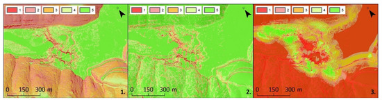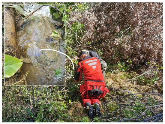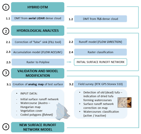 The dried-up tufa-forming watercourses, whose stream beds were filled with invasive vegetation, could not be detected in this way. They were detected through several steps (Figure 12). In the ArcMap, a surface runoff network was generated based on hybrid DTM (aerial LiDAR data + terrestrial laser scanning data). Then, the surface runoff network was overlaid with tufa-forming watercourses mapped on an Austro-Hungarian topographic map, providing good insight into where dried tufa-forming watercourses could potentially be found. Ultimately, the derived data (referent state of watercourses and vegetation) were checked in the field. Field research was performed using RTK-GPS Stonex S10 and an analogue map (A0 format) divided into regular coded polygons. On the map, extracted surface runoff network, tufa-forming watercourses mapped on an Austro-Hungarian topographic map and vegetation cover were marked. Detection of dried watercourses was also facilitated by the discovery of (old) “dead” tufa at locations of tufa-forming watercourses mapped on an Austro-Hungarian topographic map. Then, the surface runoff network data were modified and an attribute (active or inactive) was added for each watercourse (Figure 12). After the removal of the invasive vegetation and mitigation of negative anthropogenic impact, the mapping of the vegetation and the tufa-forming watercourses final state was performed following the same methodology.