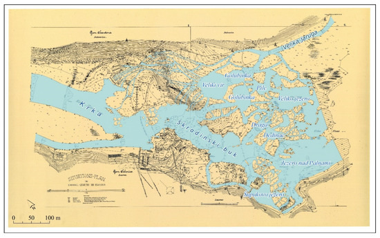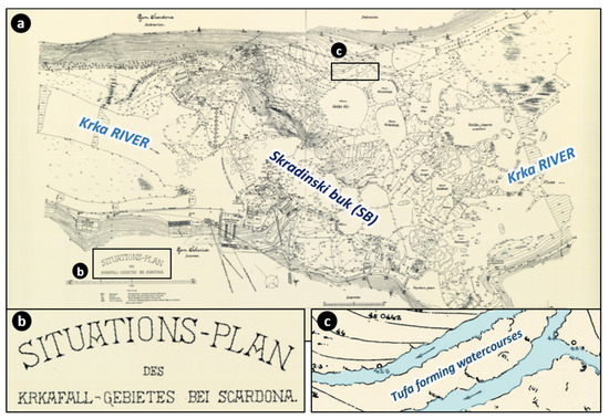 Analysis of historical data about tufa-forming watercourses on wider SB area may indicate the intensity of hydrological and geomorphological changes. The Austro-Hungarian topographic map of the wider area of SB was georeferenced and analyzed (Figure 7a). The map was created between 1881 and 1884 [49] at a scale of 1:720. The full name of the map was Situations-plan des Krkafall-gebietes bei Scardona (Figure 7b). Tufa-forming watercourses on the map are represented by arrow symbols (Figure 7c). They were mapped with a manual vectorization method (Figure 7c). The collected data served as a basis for the detection of dried tufa-forming watercourses in the wider SB area.