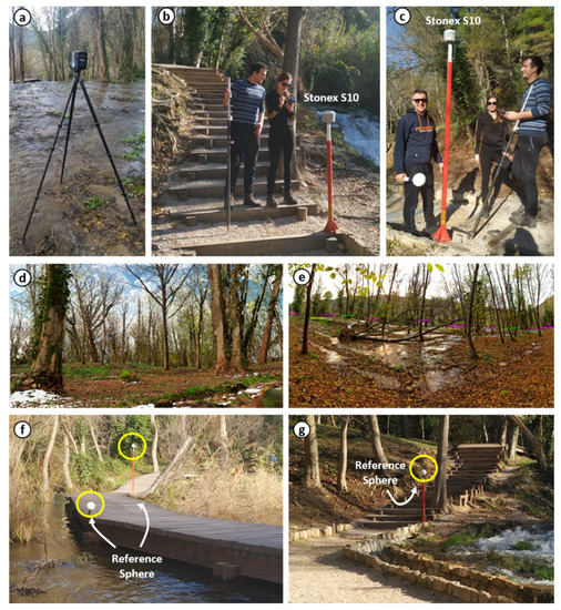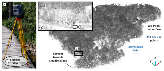Terrestrial LiDAR scanning of the vegetation and tufa-forming watercourses referent state was performed on 5–7 April 2016. Scanning was performed with the Z+F Imager 5010 TLS (Figure 8a). The scanning resolution was set to high, while the quality was normal. A total of 244,736,910 points (Figure 8) were recorded at 156 stops (over 1.5 million points per stop). The distribution of scanning stops was the result of the test surface accessibility and its morphometric characteristics. In between two scans, at least two marks were left at the same locations. The marks were placed within the scanning range and moved through the scanning process. The coordinates of the six marks were collected by the RTK-GPS Stonex S10 receiver and used for dense cloud georeferencing.