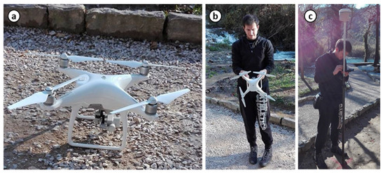 (a) Unmanned aerial vehicle (UAV) Phantom 4 used for cyclic UAV photogrammetry; (b) UAV compass calibration and (c) data acquisition of orientation points using the GPS Stonex S10.