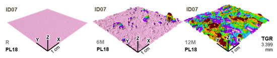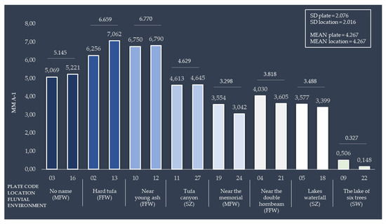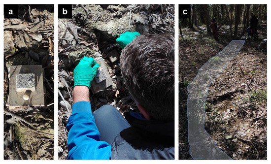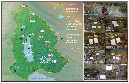 The TFD on the selected test surface was measured at 14 locations on 28 artificial PLs. The design of PLs was explained in Reference [56]. Sixteen PLs at 8 locations (Figure 13) were installed in dried tufa-forming watercourses that were reactivated after the execution of specific management measures (removal of invasive vegetation and mitigation of negative anthropogenic impacts) at the meso scale of research.