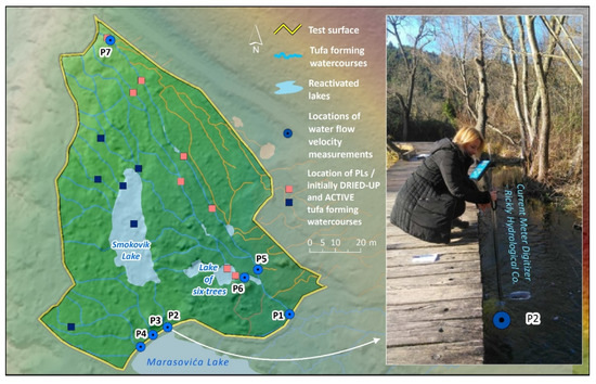 Therefore, the first (macro-) scale of research includes a set of activities aimed at selecting the most suitable smaller surface area within the wider area of Skradinski Buk (Figure 3), where specific management measures could be implemented. The second (meso-) scale of research includes mapping of the initial and final state of tufa-forming watercourses (active and dried up) and vegetation cover at defined test surface (Figure 3). At that scale, the implementation of specific management measures (selective removal of vegetation and mitigation of negative anthropogenic effects) were done with the aim of dried-up watercourse reactivation. At the last (micro-) scale of research, a system for monitoring the state of the tufa landscape was established. It consisted of four components. The first included tufa formation dynamic (TFD) monitoring on the installed artificial limestone PLs (Figure 3). The second component included systematic monitoring of the flow rate in initially active and reactivated tufa-forming watercourses. The third referred to the interval measurement of key physico-chemical parameters of water. The last, fourth component, included the monitoring of the invasive vegetation regeneration using the cyclic photography method.