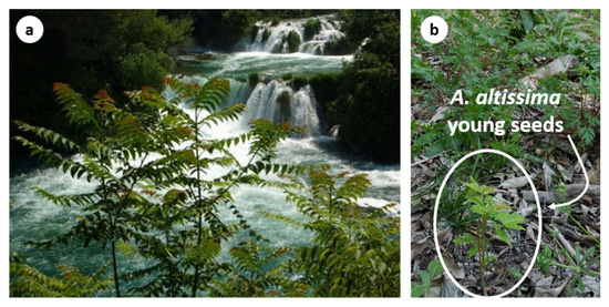 - Lodeta, V.; Novak, N.; Kravarščan, M. Tree of heaven (Ailanthus altissima (Mill.) Swingle)—Colonization in Croatia. In Proceedings of the 2nd International Workshop on Invasive Alien Plants in Mediterranean Type Regions of the World Proceedings, Trabzon, Turkey, 2–6 August, 2010; Brunel, S., Uludag, A., Fernandez-Galiano, E., Brundu, G., Eds.; European Environment Agency: Copenhagen, Denmark, 2010; pp. 350–352. [Google Scholar]