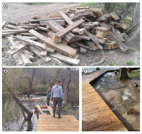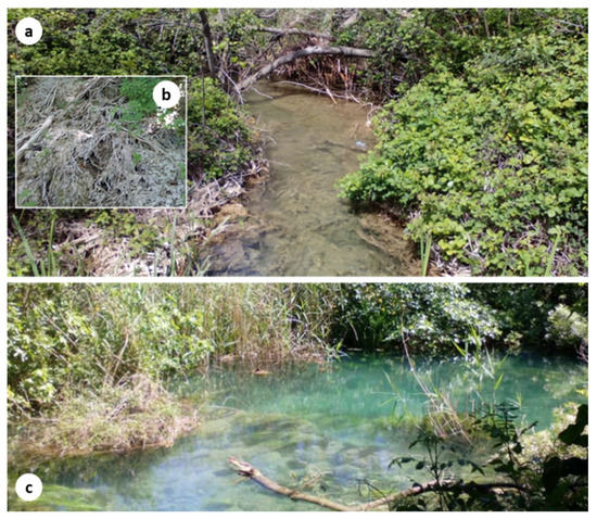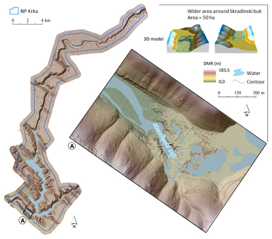 Landscapes by their very nature necessitate a multiscale approach in their monitoring, modelling and management [1,2]. One of the most complex, vulnerable and fragile systems in the world is the karst landscape [3,4]. Due to the importance of natural resource preservation and the possibility of their exploitation, interest in the management of karst landscapes is constantly growing [4,5]. One of the most spectacular depositional forms in karst landscapes are tufa [6] and travertine barrages and cascades [7] developed within river and lake systems [8]. They are geomorphological forms of universal scientific and aesthetic values [9] and are often included in the UNESCO World Heritage List. Many tufa and travertine depositional systems are popular tourist destinations (e.g., National Nature Reserve Jiuzhaigou in China, National Park (NP) Krka (NPK) and NP Plitvice Lakes in Croatia, Havasupai Canyon and Mono Lake in the USA, Namib-Naukluft NP in Namibia, Dunn’s River Falls in Jamaica, Pamukkale NP in Turkey, Huanglong in China, Una NP in Bosnia and Herzegovina, Pieniny Mountains and Ojców NP in Poland and the Barkly karst in Australia) [6,10,11,12,13]. However, tufa and travertine depositional systems are under increasing threat by climate change [14,15], the rapid expansion of tourism [16] and local anthropogenic activities [6]. Therefore, the occurrence of a degraded tufa landscape has been reported in numerous cases [6,13,15,17,18,19]. Landscape degradation can be defined as the phenomenon in which diversity relationships are ruptured or connectivity is reduced among ecosystems within the landscape [20]. The degradation of the tufa landscape can be manifested in the reduced intensity of tufa growth [13], absence of tufa-forming processes [21], increased biomass of green algae [6] (p. 2) associated with nutrient enrichment [21,22], tufa dissolution and tufa waterfall collapse [6,21]. This degradation can occur as a result of a complex interaction of biohydrochemical factors. The occurrence of tufa landscape degradation is becoming a global concern in the context of sustainable management and biodiversity conservation [23]. This can negatively affect the environmental, economic and social development of the area surrounding the protected tufa landscape. Therefore, the emergence of such threats must be fully taken into account while developing new management and action plans to achieve sustainability. Although the need to introduce a series of management measures has been recognized, degradation of the tufa landscape continues [13] in most areas where tufa formations are major natural phenomena [6,24,25].