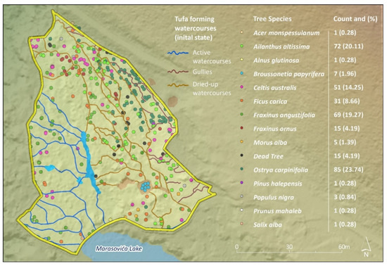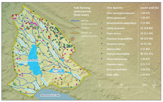 In March 2017, a mapping of vegetation cover and tufa-forming watercourses referent state was carried out. The objective was to quantify these landscape elements to develop a plan for invasive vegetation removal and to track hydrological changes after the implementation of management measures. Registered and georeferenced dense point clouds of the test surface, acquired in initial and final terrestrial laser scanning, were used in the vegetation and watercourse mapping process (Figure 11). Based on registered dense point clouds and acquired TLS images, it was possible to recognize each tree type and active watercourse on the test surface. Trees were manually mapped and classified from LAS dataset data in ArcScene software. The whole process was performed using three software packages: Cloud Compare, Faro Scene software and ArcScene.