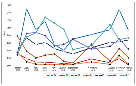 After the implementation of management measures, the water flow velocity was measured at seven locations. They were selected to cover all major water inflows to the test surface (P1–P4), key surface water flows (P5-P6) and runoff water from the surface (P7) to the old water well at the dried waterfall (Figure 14). Flow velocity was measured with a current meter digitizer, Rickly Hydrological Co., Although it would be ideal to measure the water flow velocity rate at individual plate locations, device logistical limitations precluded this operation. Before the implementation of management measures, there was no water at sites P1, P5, P6 and P7. These were dried-up tufa-forming watercourses. The water flow velocity was measured several times a month.