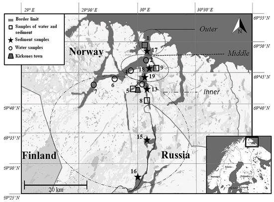 The Pasvik River is the largest river system in the northern Fennoscandia. The watershed is the area of the border between Finland, Norway, and Russia. The river starts from the Inari Lake (Finland; freezing period normally extends from November to early June), north of the Arctic Circle, and flows into the Bøkfjorden (Norway), which is part of the Varangerfjord in the Barents Sea. A large number of lakes, wetlands and rivers with rapids characterize the hydrographic network of the Pasvik River basin. The annual mean air temperature is rather low, i.e., −3 °C. The watercourse is surrounded by a birch and pinewood landscape with stretches of boggy land. The water conditions in the Pasvik River are representative of Eastern European rivers. A high spring flood, increased autumn flow, and periods of low water in summer/autumn and autumn/winter characterize the annual fluctuation in its water level. The precipitation in the area is low, with an annual mean of 358 mm. The overall fluctuations of water level are small (approximately −80 cm). The ice-free season lasts from May–June to October–November. The river collects snowmelt, with a considerable proportion of rainwater and groundwater flow, and it is typically a freshwater environment at its inner zone and brackish at its outer zone [16,17].