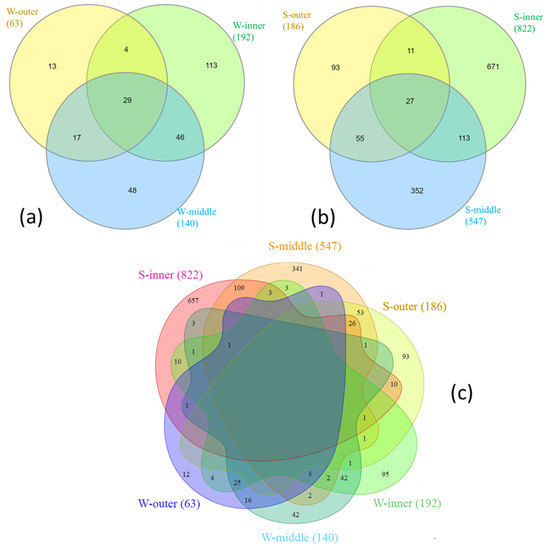 Venn diagrams showing unique and shared OTUs (a) among water samples by sampling zone, (b) among sediment samples by sampling zone, and (c) among all samples by sampling zone. The number of OTUs per sampling site is in bracket.