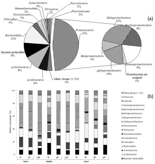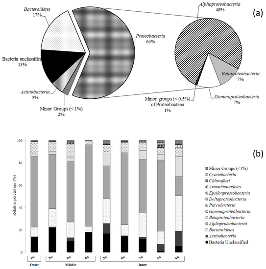 Proteobacteria reads were predominantly affiliated to Alphaproteobacteria (48.1% of total reads), followed by Gamma- (14.0%) and Betaproteobacteria (7.2 and 7.1%, respectively). Delta- and Epsilonproteobacteria were less represented (0.2 and 0.05%, respectively) (Figure 3a). Main bacterial taxa generally occurred at all stations (Figure 3b). Alphaproteobacteria predominated in almost all water samples, reaching the highest relative percentage (i.e., 72.8%) at the middle station 4w, followed by Betaproteobacteria (from 0.7 to 17.9% at stations 4w and 8w, respectively). Gammaproteobacteria also occurred at all sampled stations, ranging between 11.5 and 2.5% at sampling stations 9w and 4w, respectively. The CF group of Bacteroidetes was well represented, with the highest value (31.9%) at the inner station 8w. Actinobacteria were also retrieved at all sampling stations (range 0.2–13.1%), as well as Cyanobacteria (range: 0.3–1.2%). Parcubacteria occurred at six of the nine sampling stations (i.e., 4w, 3w, 6w, 7w, 5w, and 8w), as well as Chloroflexi (i.e., 2w, 9w, 3w, 6w, 5w and 8w), with a relative percentage ranging between 0.03–2.8% and 0.03–1.3%, respectively. Armatimonadates were only in four sampling stations (i.e., 9w, 3w, 5w, and 8w), ranging between 0.1 and 1.6%.