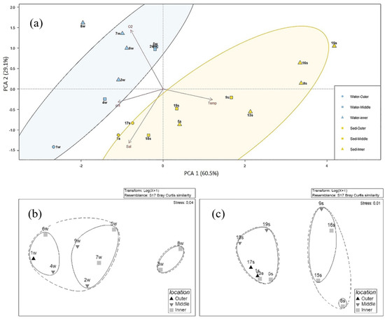 PCA was carried out separately for water and sediment samples to determine the most important variables (physicochemical properties) that explain the relationship between nine water and ten sediment samples, respectively, and to detect any group patterns. The bacterial community composition in water was mainly influenced by oxygen (Figure 5a). The two main components explained the 89.6% of the total variance, with axis 1 (60.5% of the variance) that was mainly expressed by temperature and pH, and axis 2 (29.1% of the variance) where the greatest weight was given by salinity and oxygen concentration. The analysis indicated a clear separation of water and sediment, with salinity inversely correlating with both first and second coordinates. The oxygen concentration was negatively correlated with the first component and positively correlated with the second one. Water and sediment samples grouped separately, suggesting a different influence of environmental parameters on biodiversity level. Salinity and temperature seemed to be more impactful on sediment than water samples. The figure shows a sort of gradient in the spatial distribution of samples, with all samples from the outer stations on the bottom of graph, most samples from middle stations and part of samples from the inner stations in the center of the PCA ordination, and finally samples from most of the inner stations distributed for both water and sediments on the top of graph (namely, stations 3w, 6w, 7w, 8w, and 15s and 16s). Sample from station 1w, which presented the lowest oxygen concentration and highest salinity values among water samples, appeared isolated from all the other. As well as for station 4w, which recorded similar salinity percentage, in these samples some taxonomic groups were absent at genus level. Interestingly, samples from 8s, 15s and 16s (inner Stations) appeared isolated from the others, by showing the strongest negative correlation with salinity. On the contrary, among sediment samples those from stations 1s, 17s and 18s were the more strongly positively correlated with salinity.