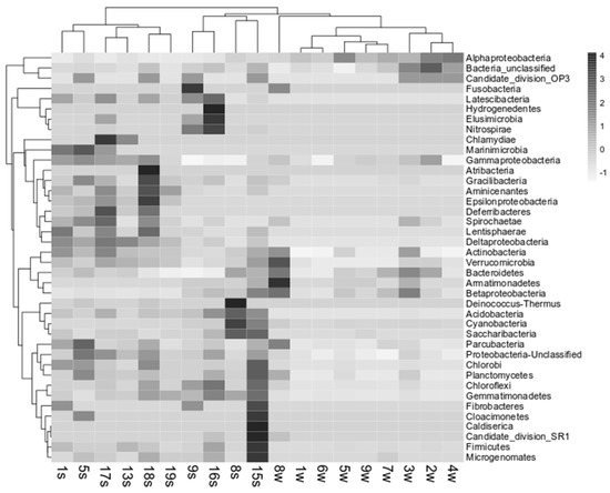 Overall, the Ion Torrent sequencing of the V1–V2 region of the bacterial 16S rRNA gene produced 106,641 sequence reads. After quality check and removal of chimeras, 36,157 high-quality sequences were obtained. A higher diversity was observed in sediment than in water samples, with a H’ index that was in the range 4.94 to 6.78 and 1.70 to 4.70, respectively. A total of 4597 OTUs were obtained with the highest number (i.e., 288) that was found in the sediment sample 15s and the lowest (i.e., 63) that was found in the water sample 1w (Table 2).