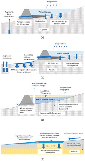 Types of in-channel modification for managed aquifer recharge (MAR): (a) a recharge dam where the majority of recharge occurs through the base of the pond, (b) a wadi-recharge dam where recharge is increased by controlled release downstream and infiltration through the riverbed, (c) a sand storage dam where water is stored within the semiartificial aquifer built up behind the dam, and (d) a riverbed modification to enhance recharge by removal of alluvial sediments and replacement with gravel fill.