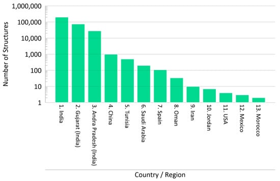 A review of the IGRAC MAR Portal and the literature identified approximate numbers of recharge dams by each country/region, which are summarized in in Figure 2, based on data from [,,,,,,,,], with photographs of recharge dams shown in Figure 3 [,] that represent different construction methods. It is likely that these numbers are significantly underestimated, as these are small structures not frequently studied or reported in scientific literature. The MAR Portal is not reflective of the large total numbers shown in Figure 2, as the inclusion criteria for the MAR portal required a specific location for each structure to be available [].