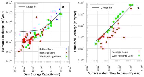 (a) Dam storage capacity (m3) vs. estimated annual recharge (m3). (b) Estimated annual runoff vs. estimated groundwater recharge for recharge dams and wadi-recharge dams (no equivalent data for rubber dams).