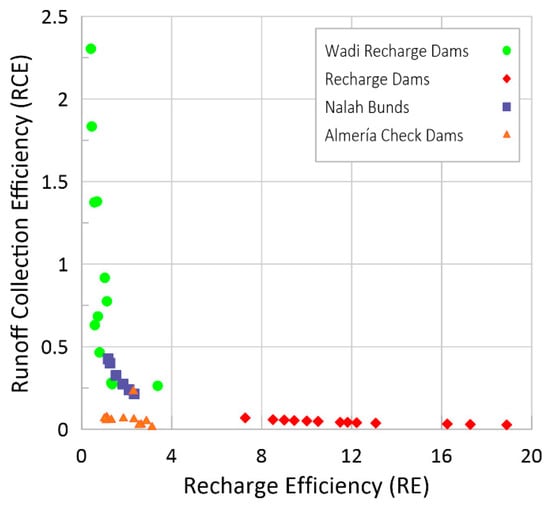 RE is plotted against RCE in Figure 5 where both measures could be calculated. Both RE and RCE are dependent on the provided estimates of recharge presented in the literature, and it should be noted that recharge can be calculated using several different methods (see Section 4.3), which introduces additional uncertainty to this analysis. Wadi dams generally have a higher RCE than other recharge dams, but their RE values are the same as many check dams and nalah bunds, and lower than some check dams. The higher RCE is a reflection of hydrological situation with fewer, higher intensity rainfall events, and the comparatively larger storage capacities can intercept a greater proportion of the runoff. The low frequency of these events is thought to result in the low RE values. In Jordan, four check dams in the Wadi Madoneh were constructed with capacities from 2000 to 66,400 m3, and three of these were designed to capture flows up to the 1-in-2-year event, with one dam capturing up to the 1-in-5-year event. In conclusion, Figure 5 shows that collecting a higher proportion of runoff (higher RCE) does not necessarily increase the recharge effectiveness (RE value), and therefore where MAR is the main aim, then smaller, less expensive structures that capture a lower proportion of the runoff may be more effective per m3 of storage provided.