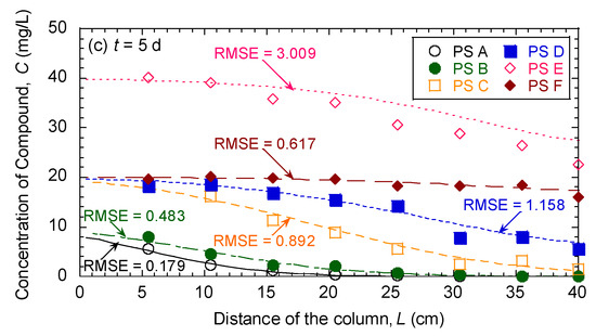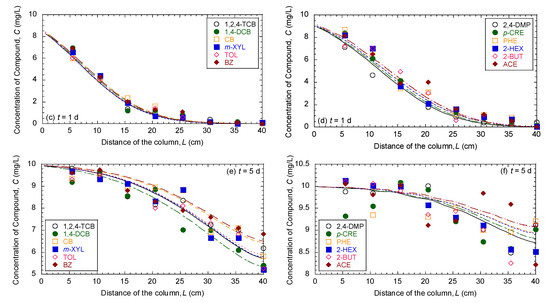 Comparisons between the measured versus fitted breakthrough curves (i.e., effluent samples) and predicted concentration profiles (i.e., pore-water samples at t = 1 and 5 days) according to the column tests are shown in Figure 2, Figure 3 and Figure 4 for simulated aquifer sands with foc of 0.006%, 0.051%, and 0.221%, respectively. On the basis of both breakthrough curves and concentration profiles displayed in Figure 2, Figure 3 and Figure 4, the organic compounds in mixtures were sorbed to different extents, and sorption to simulated aquifer sands generally decreased with the increase in polarity of organic compounds. The relatively slow migration of nonpolar organic compounds suggests that substantial amounts of molecules were transferred from the water matrix to the humic acid (HA) coated on the surface of simulated aquifer sands. In contrast, the sorption of the polar organic compounds did not expressively change with the increase in foc values. These results are consistent with the results from batch equilibrium sorption tests, indicating that sorption of organic compounds to simulated aquifer sands mainly results from sorption to HA when foc is greater than the threshold value (i.e., 0.1%), and more hydrophobic organic compounds were sorbed due to the different dependence of sorption on foc values of simulated aquifer sands [1,2,3]. Although the single column test for each simulated aquifer sand was performed without replicates, reasonably measured breakthrough curves and concentration profiles from both preliminary tracer tests and column tests were obtained in this study.